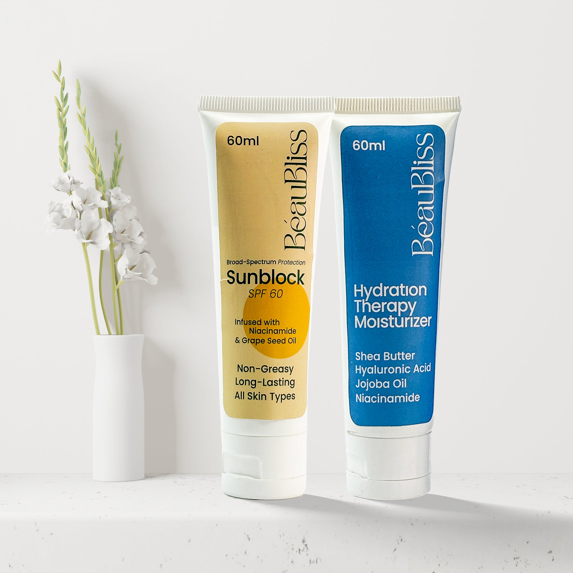 Simple, effective, and essential — the Beau Bliss Hydrate + Shield bundle includes our best-selling Hydrating Moisturizer and Broad-Spectrum SPF60 Sunblock. This minimal yet powerful skincare duo keeps your skin soft, nourished, and protected from harsh UV rays, pollution, and environmental stressors — perfect for everyday wear in Pakistan’s heat and humidity.